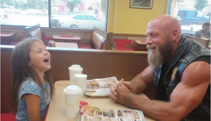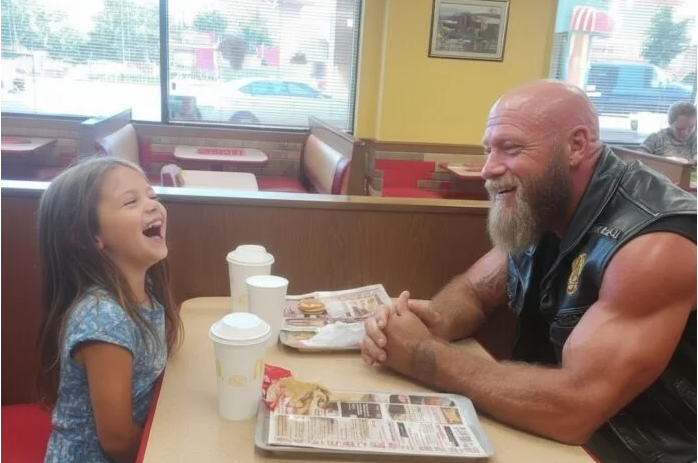Tall, broad-shouldered, his arms covered in tattoos, his face marked with scars, and his leather vest patched with symbols most people didn’t recognize. Parents in the McDonald’s dining room whispered when he walked in. The manager frowned whenever he ordered food. Even other customers kept their distance, certain he was dangerous.